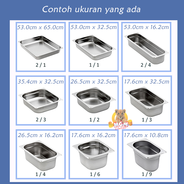 Food pan biasanya datang dalam berbagai macam ukuran yg anda bs lihat seperti di gambar untuk kebutuhan anda.