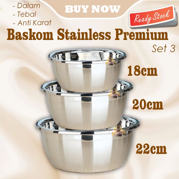 SET3 Baskom stainless PREMIUM 18/20/22cm TEBAL anti karat baskom dalam